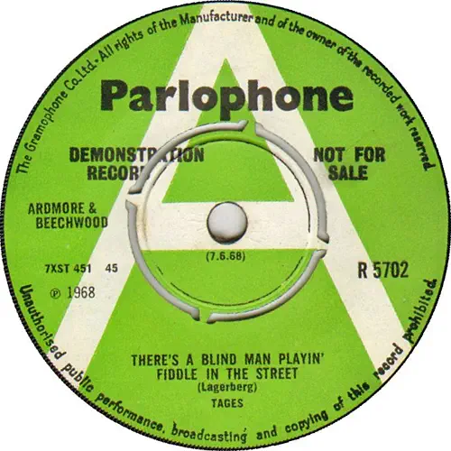 A. There's A Blind Man Playin' Fiddle In The Street B. Like A Woman PARLOPHONE R 5702 PROMO ENGLAND 1968