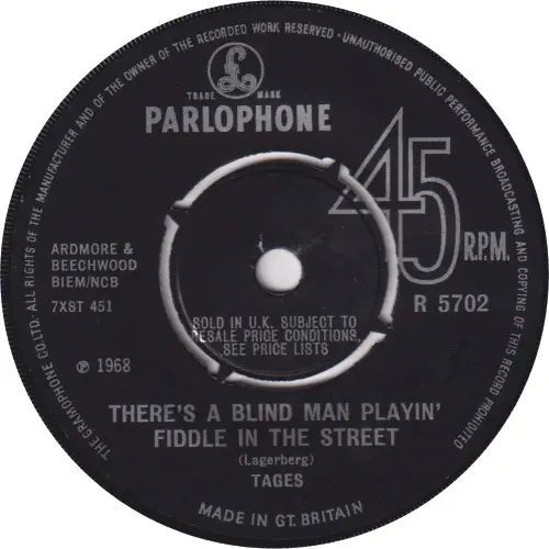 A. There's A Blind Man Playin' Fiddle In ….. B. Like A Woman PARLOPHONE R 5702 ENGLAND 1968