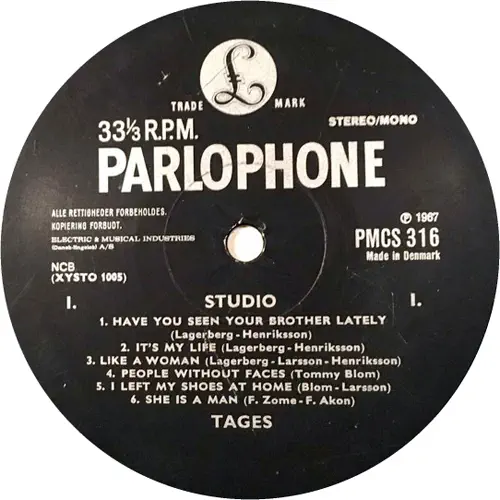 STUDIO PARLOPHONE PMCS 316 DANMARK 1967