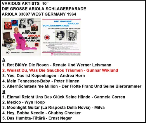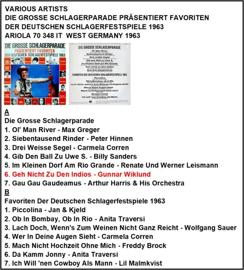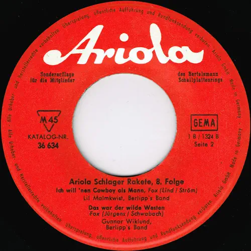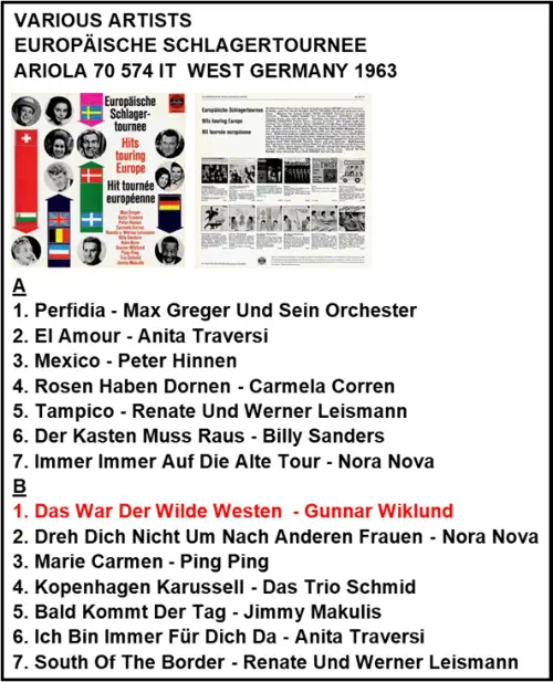 A1. Im Kleinen Dorf Am Rio Grande - Renate U A2. Ob In Bombay, Ob In Rio - Anita Traversi B1. Ich Will 'nen Cowboy Als Mann - Lil Malmkvist B2. Das War Der Wilde Westen - Gunnar Wiklund ARIOLA 36 634 VÄSTTYSKLAND 1963