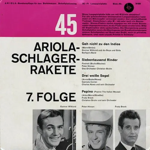 A1. Geh Nicht Zu Den Indios - Gunnar Wiklund A2. Sibentausend Rinder - Peter Hinnen B1. Drei Weiße Segel - Carmela Corren B2. Pepino (The Italian Mouse) - Freddy Brock ARIOLA 36 650 VÄSTTYSKLAND 1963